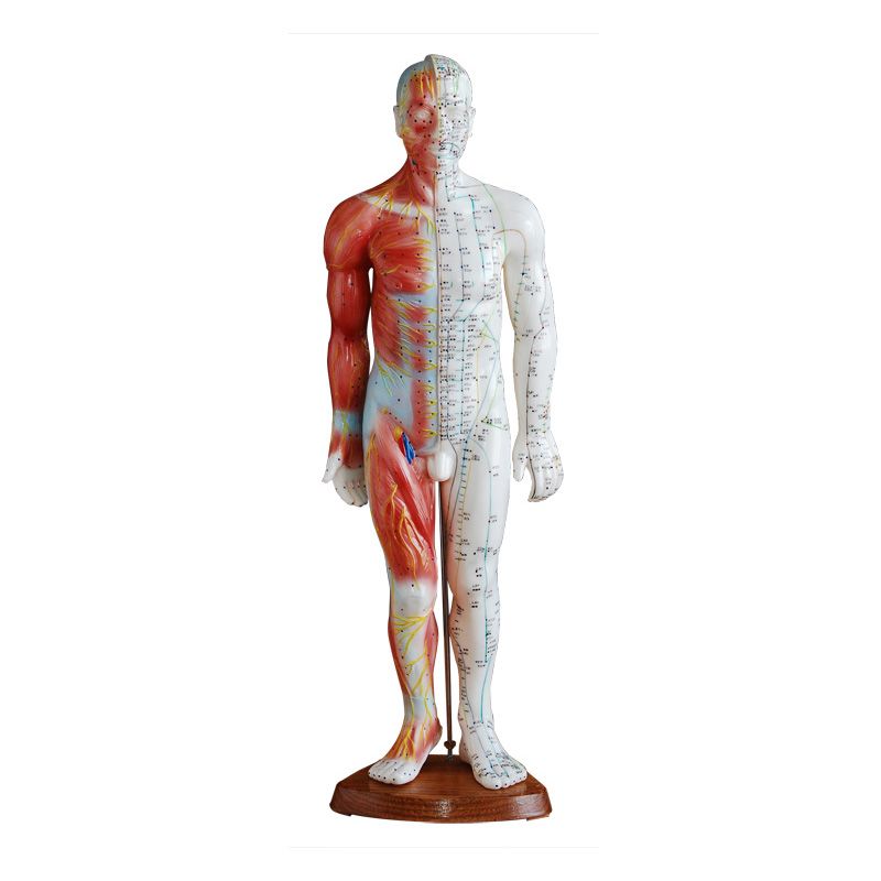 This model is marked 14 in detail the main meridian line, the distance on the right side of the body 361 via exterior meridian point and 48-degree line and bone, i.e., with the "size" to easily measure the acupuncture points. The left side of the body is the subcutaneous tissue, showing the distribution of the nervous system, arteriovenous, blood vessels and muscle structure, also marked in the main meridians not marked outside the cave by hand and foot. Applicable to the teaching of Chinese medicine, such as acupuncture and massage.